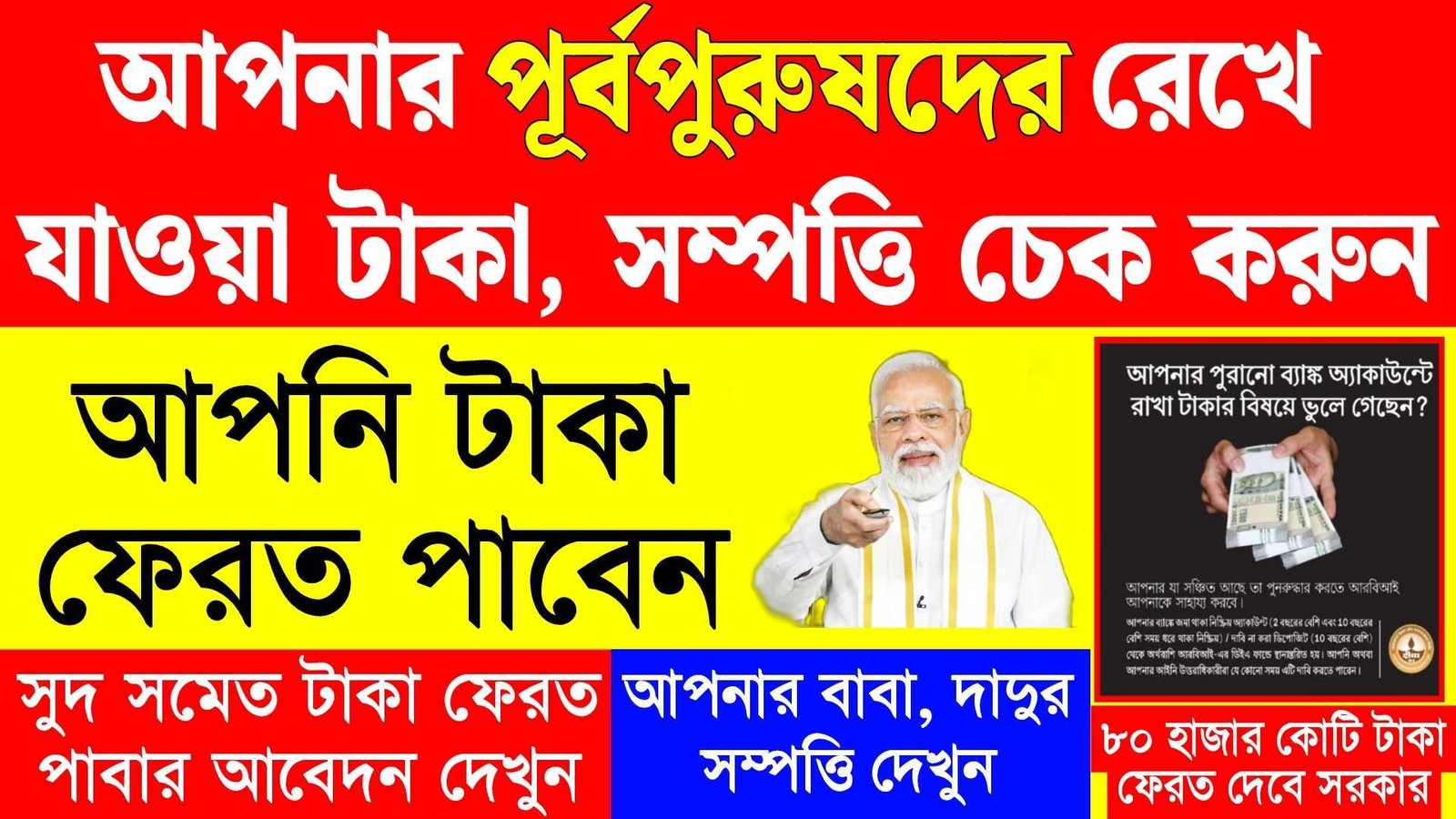 আপনার নামে বা আপনার পূর্বপুরুষদের নামে কোন টাকা ব্যাংকে জমা রয়েছে কিনা বা কোন সম্পত্তি রয়েছে কিনা সেটি চেক করার জন্য নিচের দেওয়া লিংকে ক্লিক করুন:- CLICK HERE