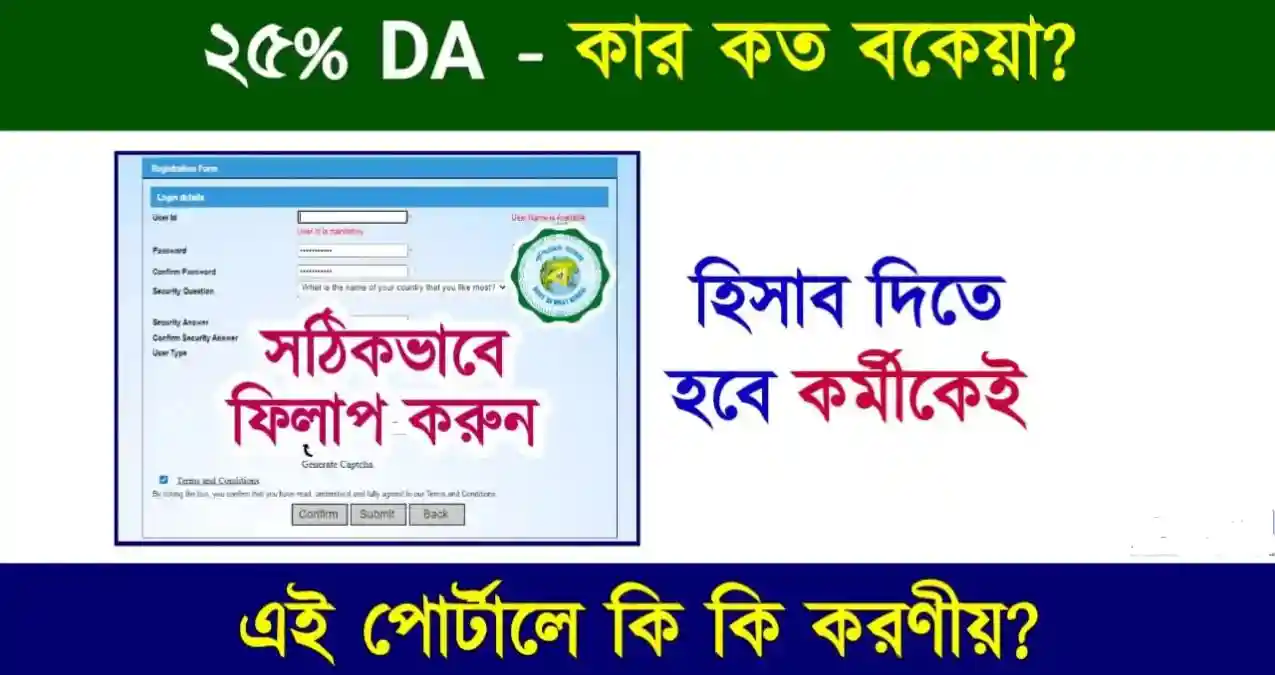 ২৫ শতাংশ বকেয়া DA এর ক্ষেত্রে সকলের পাওয়া সমান নয়। ডিএ এর হিসাবটা (Dearness Allowance Calculation) সাধারণত কর্মী বা পেনশনার্স এর বেসিক এর উপরে হিসাব হয়। তাছারা ২০০৯ এর পর যারা কাজে জগদান করেছেন, তাদের ও ১০ বছরের চেয়ে কম বকেয়া রয়েছে, তাই এই হিসাবটা প্রত্যেক কর্মীর ক্ষেত্রে আলাদা হবে। আর সেই কারণে কর্মীদের নিজ নিজ বকেয়া কত হয়েছে, তা নির্দিষ্ট ফরম্যাটে জানাতে হবে। সেই সমস্যা সমাধানে নবান্নের নয়া প্রযুক্তি। নতুন পোর্টালে সেই হিসাব জানাতে হবে।