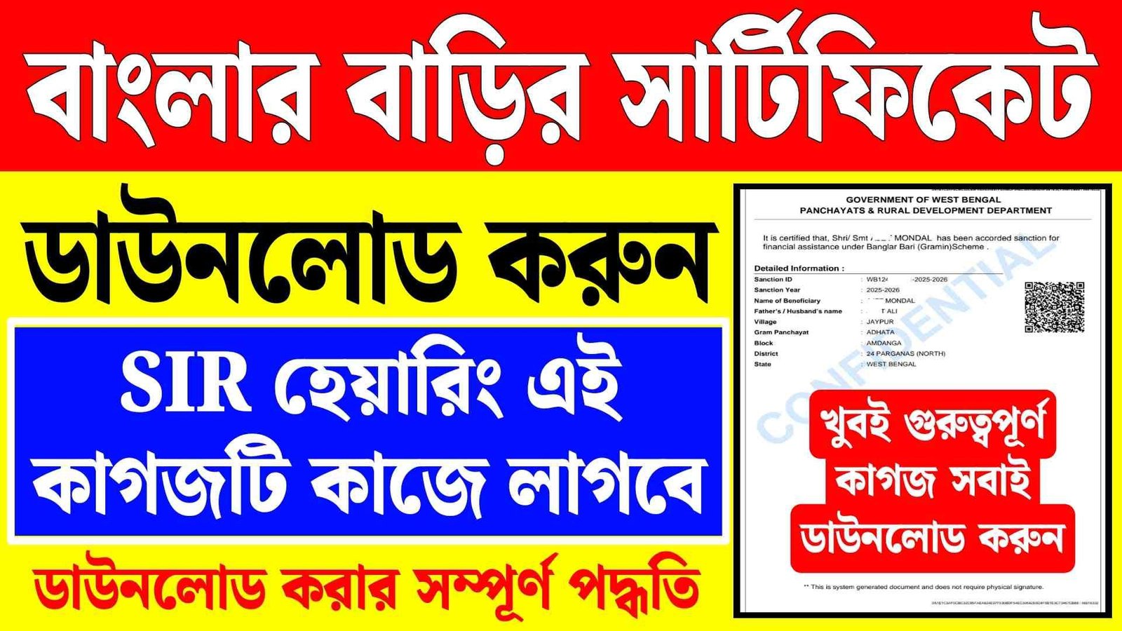 সুতরাং এই SIR আবহে বাংলার বাড়ির সার্টিফিকেট আপনার অনেক কাজে আসতে পারে । আজকের এই প্রতিবেদনে আমরা আলোচনা করব আপনি কিভাবে বাংলার বাড়ির সার্টিফিকেট ডাউনলোড করবেন ।