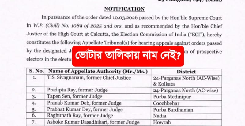 ২০২৬-এর বিধানসভা ভোটের আগে ভোটার তালিকা নিয়ে বড়সড় দুশ্চিন্তায় রয়েছেন রাজ্যের লক্ষ লক্ষ মানুষ। সাপ্লিমেন্টারি তালিকায় নাম উঠবে কি না, বা নাম বাদ পড়লে কার কাছে যাবে এই সব প্রশ্নের সমাধানে এবার নজিরবিহীন পদক্ষেপ নিল নির্বাচন কমিশন। সুপ্রিম কোর্টের নির্দেশে রাজ্যে মোট ১৯ জন অবসরপ্রাপ্ত বিচারপতিকে নিয়ে বিশেষ একটি আপিল আদালত বা ট্রাইব্যুনাল গঠন করা হয়েছে। শুক্রবার বিজ্ঞপ্তি জারি করে কমিশন জানিয়েছে, ভোটার তালিকা নিয়ে যে কোনও অভিযোগের বিচার করবেন এই অভিজ্ঞ বিচারপতিরাই।
