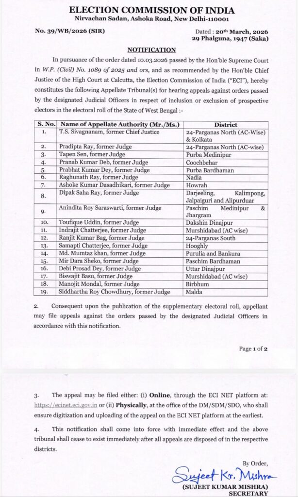 তবে, এই ট্রাইব্যুনালগুলি কেবল ২০২৬ সালের এসআইআর প্রক্রিয়ার সংশোধনের জন্যই কাজ করবে এবং সব বিচারাধীন ভোটারদের আপিল নিষ্পত্তি হওয়ার সঙ্গে সঙ্গেই ট্রাইব্যুনালের মেয়াদ শেষ হবে।