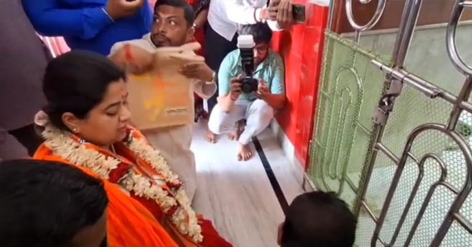 বর্ধমান: নির্বাচনের মরশুমে মন্দিরে পুজো দেওয়াকে কেন্দ্র করে বর্ধমান দক্ষিণ বিধানসভা কেন্দ্রে (Bardhaman) তুঙ্গে উঠল রাজনৈতিক বিতর্ক। বর্ধমানের ঐতিহ্যবাহী কঙ্কালেশ্বরী কালীমন্দিরে পুজো দিতে গিয়ে ফিরে আসতে হল বিজেপি প্রার্থী (BJP candidate) মৌমিতা বিশ্বাস মিশ্রকে। অভিযোগ, তৃণমূল বিধায়কের ‘গড়’ হিসেবে পরিচিত ওই এলাকায় মন্দিরের গেটে তালা ঝুলিয়ে দেওয়ায় ভেতরে ঢুকতে পারেননি তিনি। শেষ পর্যন্ত তালাবন্ধ গেটের সামনে দাঁড়িয়েই পুজো সারতে হয় তাঁকে।