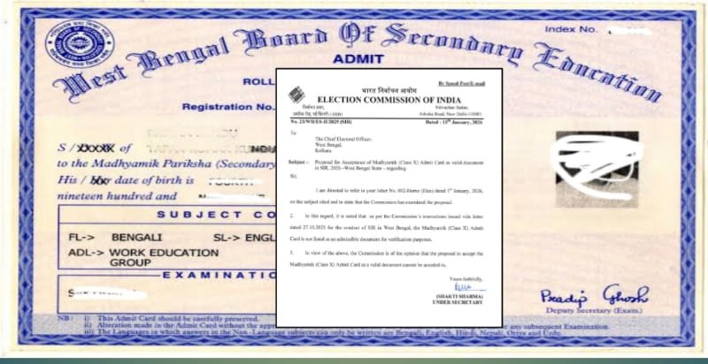 বৃহস্পতিবার নির্বাচন কমিশনের তরফ থেকে রাজ্যের মুখ্য নির্বাচনী আধিকারিক (CEO) মনোজকুমার আগরওয়ালকে চিঠি পাঠিয়ে এই সিদ্ধান্তের কথা জানায়। কমিশনের চিঠিতে উল্লেখ করেছে, এসআইআর এর শুনানিতে মাধ্যমিকের অ্যাডমিট কার্ড কোনওভাবেই গ্রহণযোগ্য হবে না।