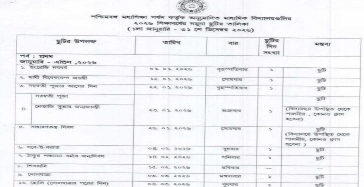West Bengal Secondary School Holiday List 2026: পশ্চিমবঙ্গ মধ্যশিক্ষা পর্ষদের ছুটির তালিকা ২০২৬ প্রকাশ দেখুন লিস্ট!